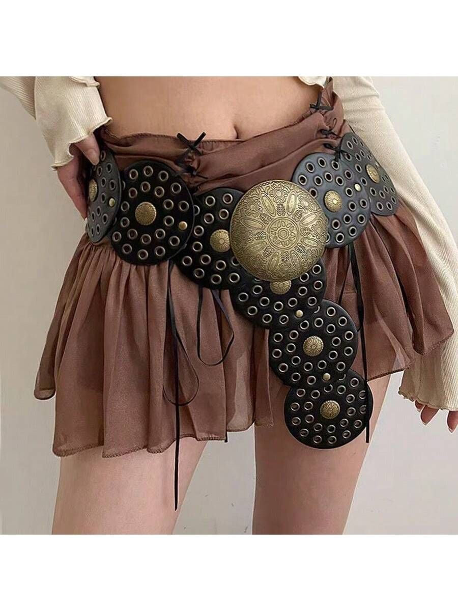 Cinturón mujer Boho de material cuerina con hebilla grabada metálica y detalles de ojetillos y tachas por todo el cinturón.